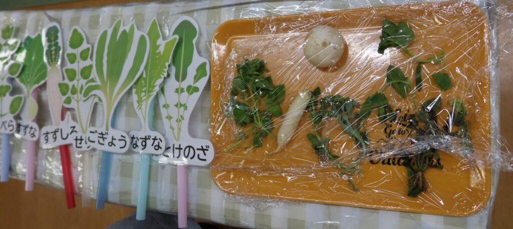 春の七草です。おやつに 七草粥を食べました。お家でも食べたかな?